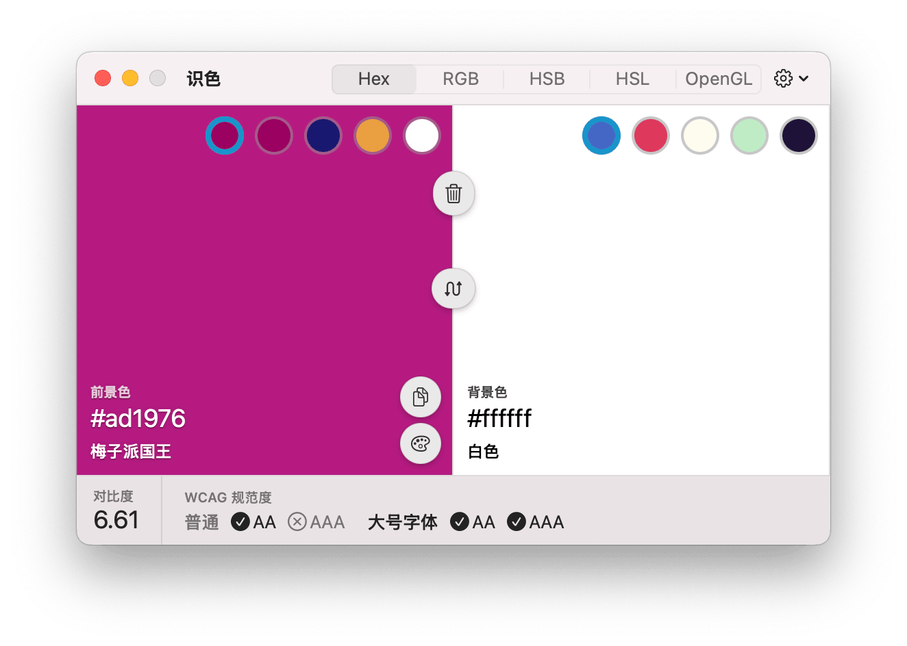 识色窗口底部会显示您选择的前景色和背景色的对比度满足情况——当对比度不满足要求时,在普通或者大号字体中将会有灰色x